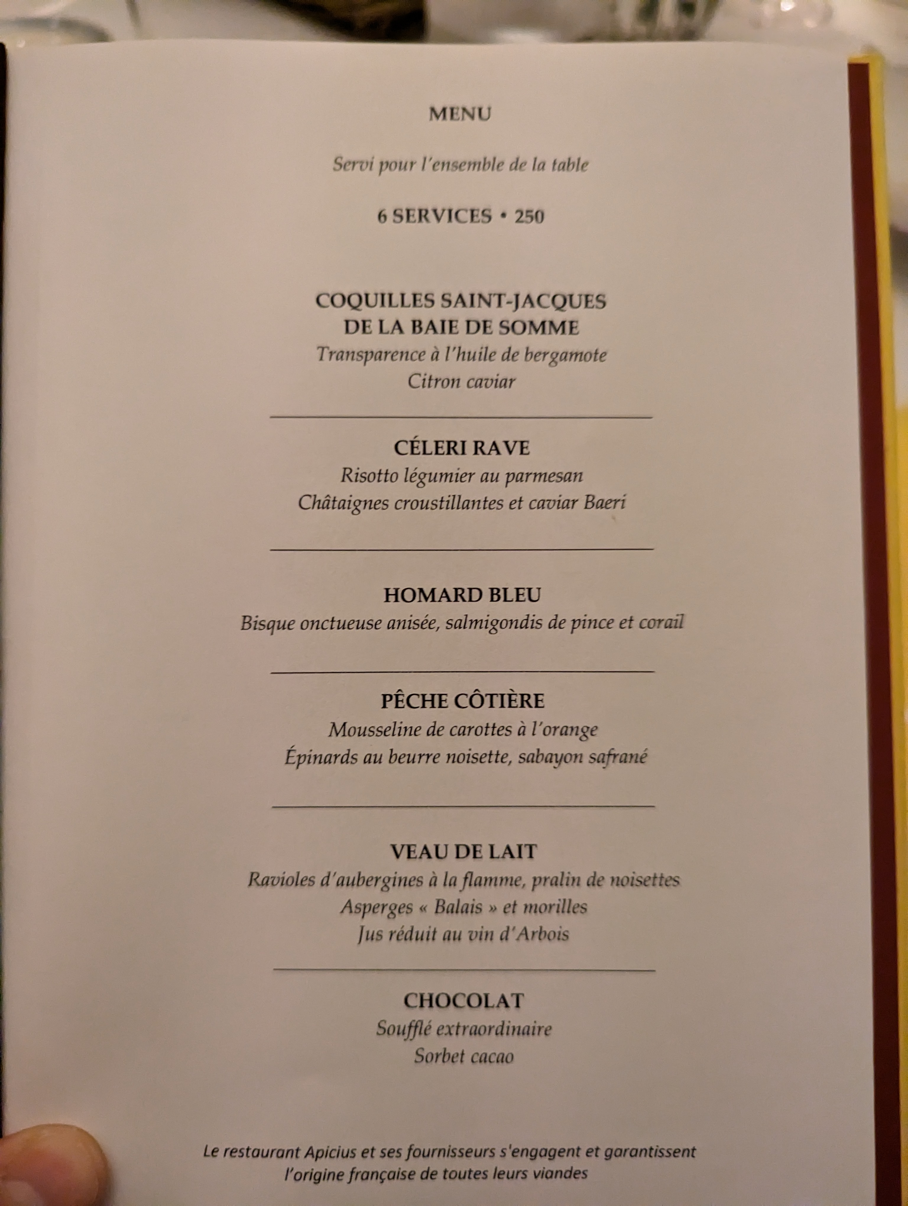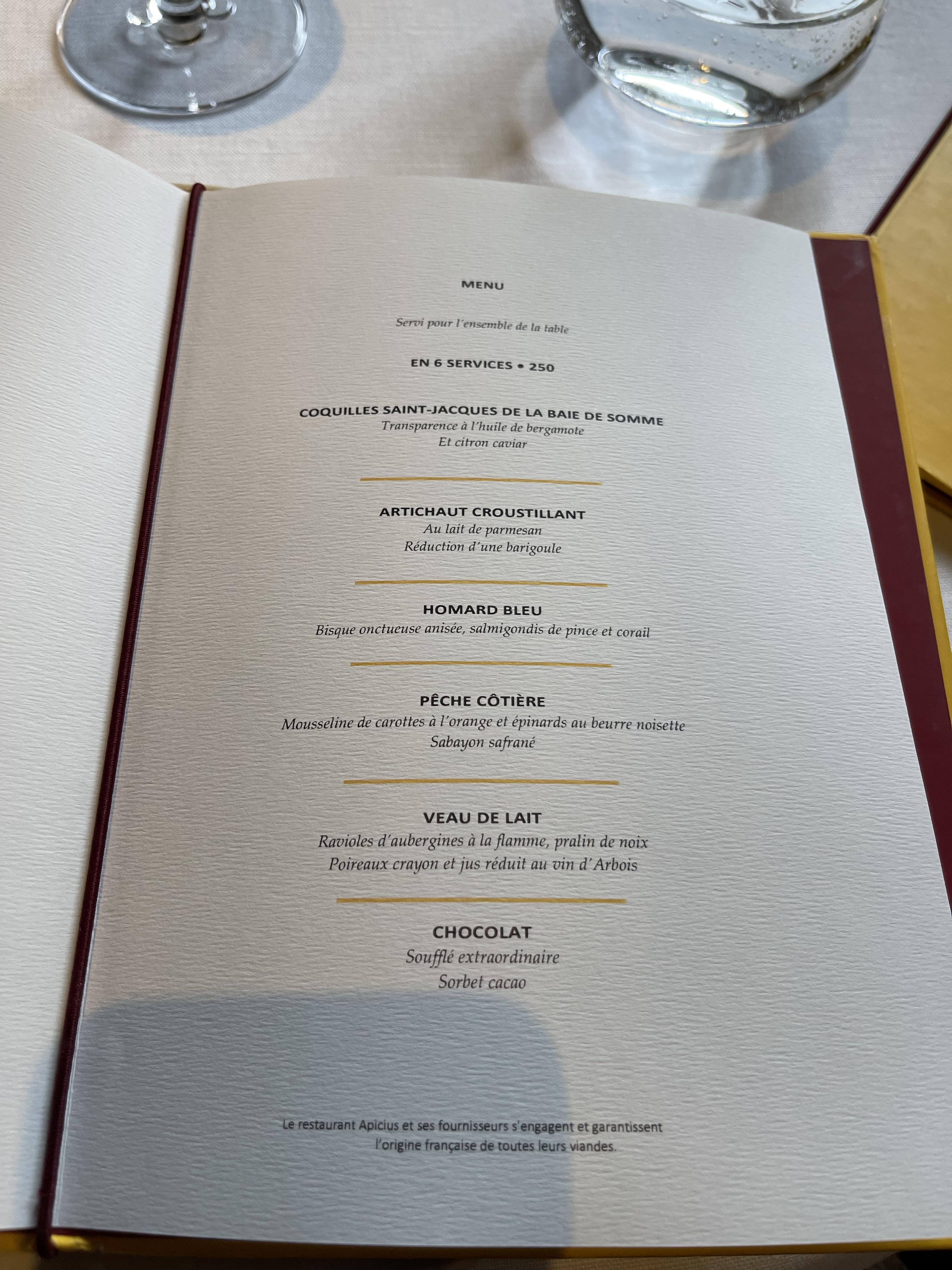 Apicius est l'alliance d'une expérience culinaire de grande qualité et d'un cadre magnifique. Nous avons dîné en intérieur dans le salon principal exceptionnel. Le menu en 6 services est à la frontière de la seconde étoile.