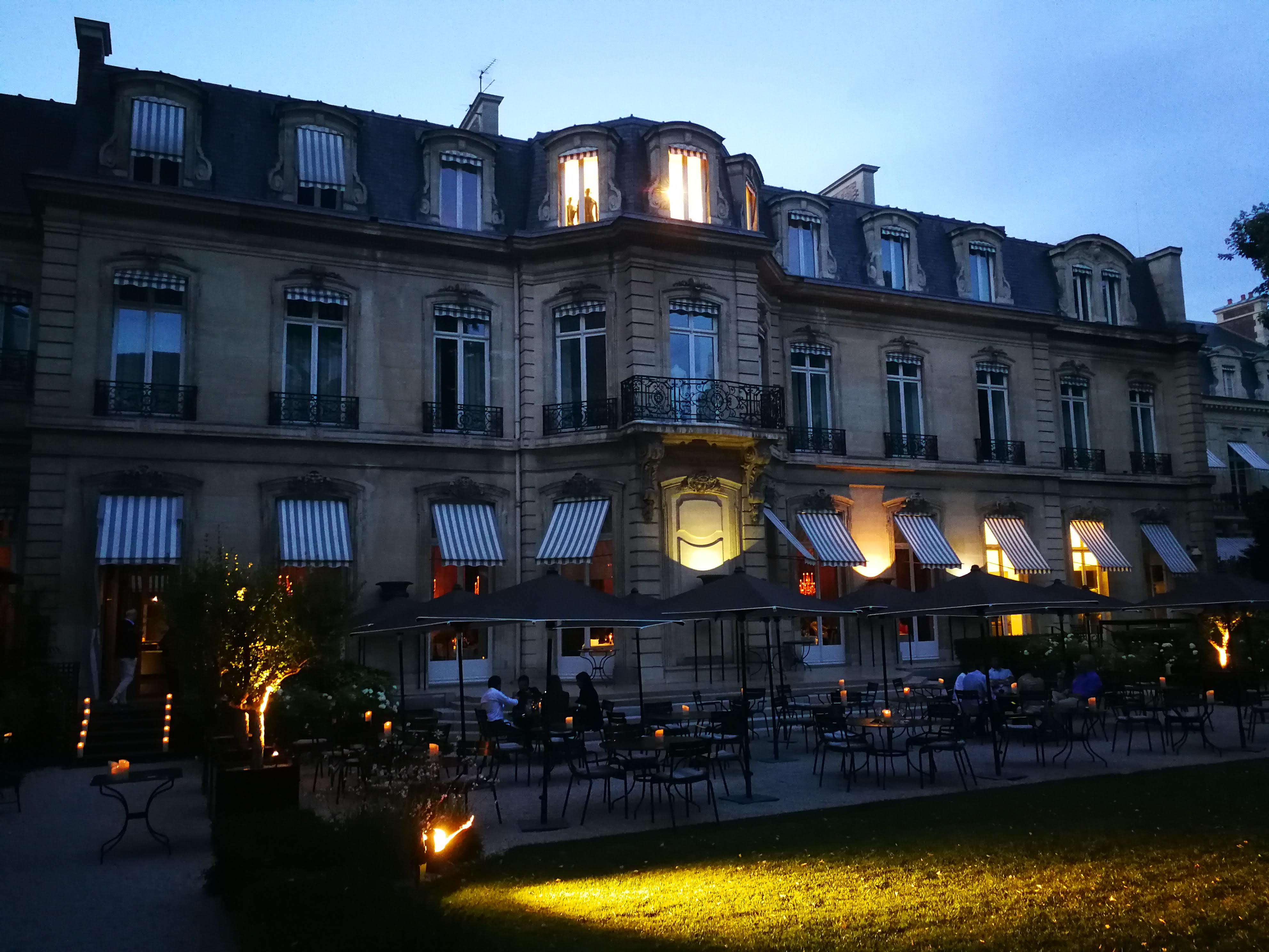 On commence par un cocktail en terrasse, très bien. Puis on rentre pour dîner, dans un cadre agréable, calme, idéal pour repas romantique. Dans les assiettes, on se régale et ne regrette pas d'être venus. Le cadre, cet écrin de verdure et cet hôtel particulier sont juste exceptionnels pour Paris