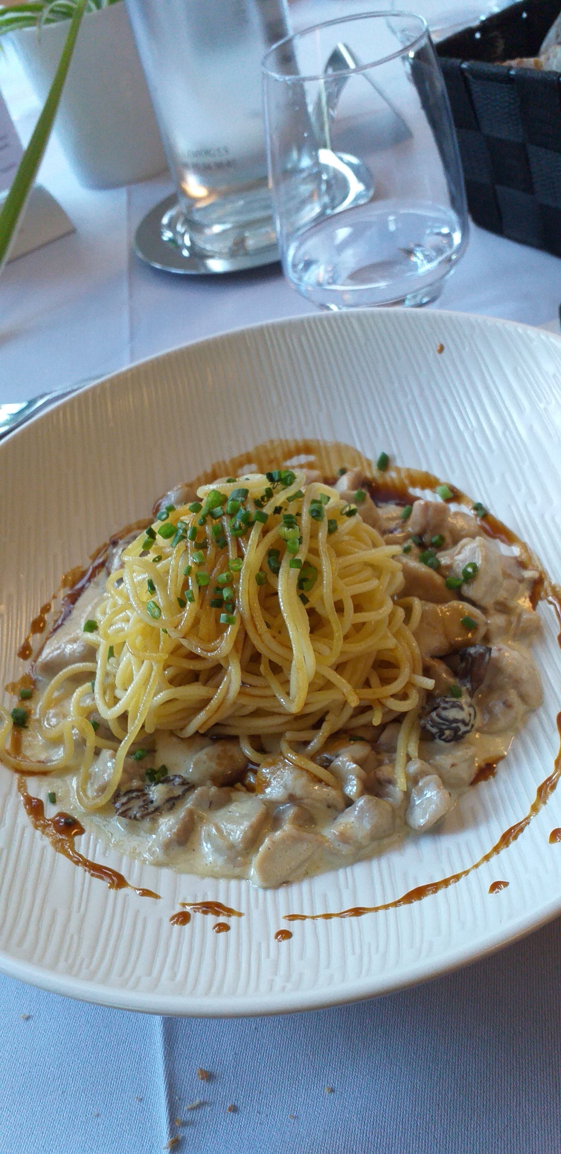 Dommage de mélanger le foie gras avec autre chose... il se suffit largement à lui même.. Le plat ris de veau excellent, au demeurant, mais chargé de spaghettis sur son centre...d'où beaucoup de volume dans l'assiette et peu de ris de veau autour, de plus servi froid ou à peine tiede.. ce plat se mange chaud !!! De plus spaghettis... aucun autre choix !!! pour 44 € le repas. Dessert passable !!! Non la prestation n'y est pas !!! Dommage
