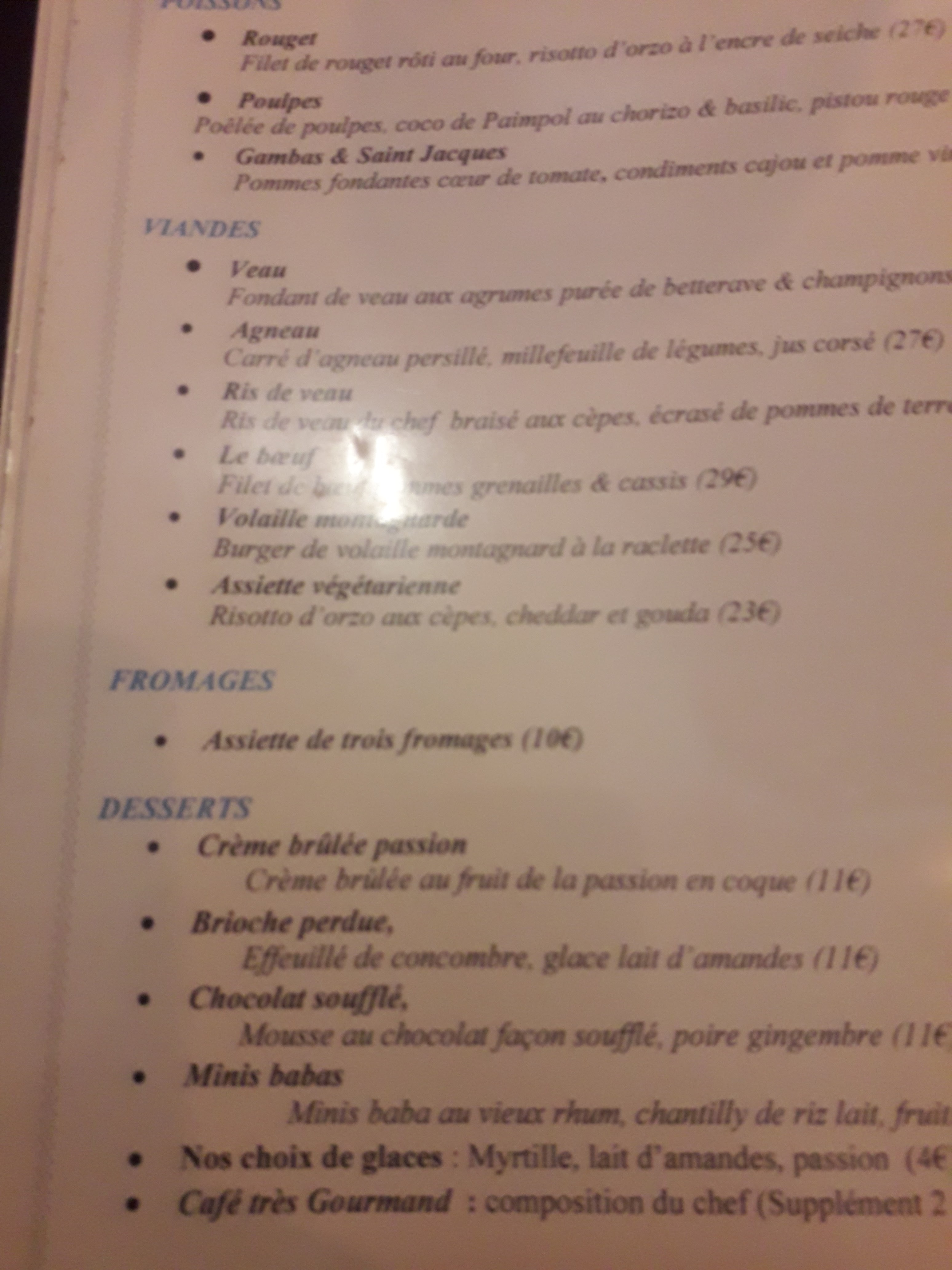 Cuisine réchauffée, deux menus, mais la différence de prix ne se justifie pas, mis à part plus de choix pour le menu le plus élevé. Mes plats étaient bon mais sans plus (exemple rognons mal nettoyés)