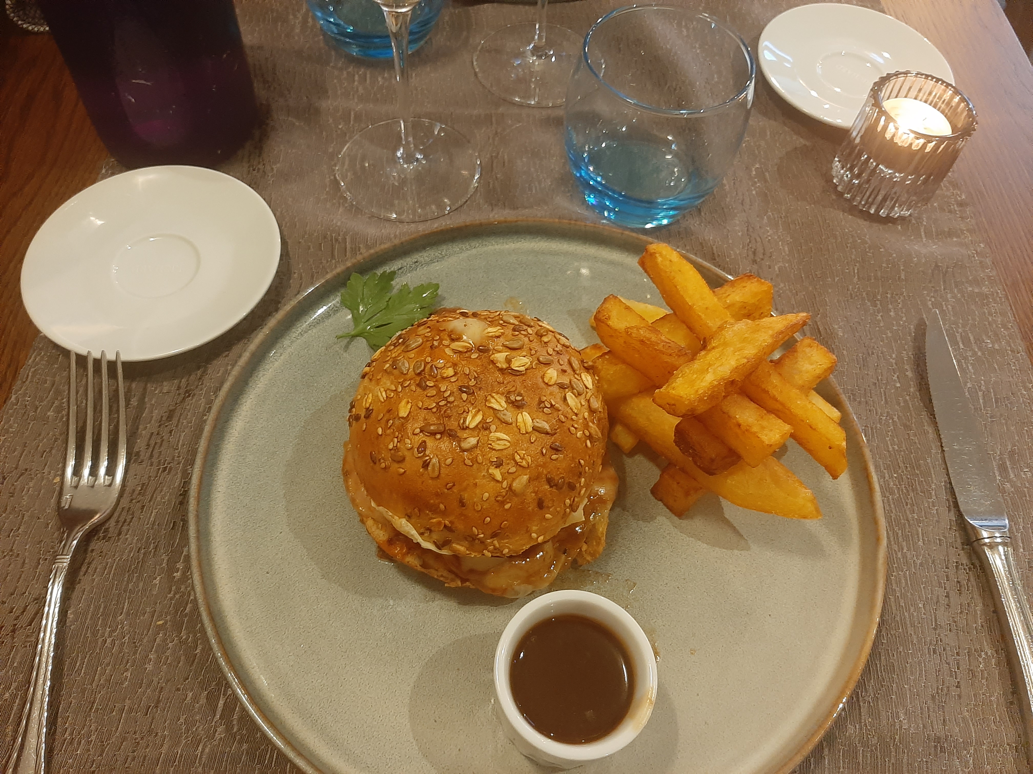 Excellent restaurant gastronomique à Houdan. Décoration sobre, ambiance tranquille.(Réservation de préférence). Menu 46€(il y en a d'autres, plus cher ou moins mais sans entrée ou dessert), entrée,plat, dessert, hors boisson. Entrée foie gras maison impeccable, burger de volaille superbe ( le pain est excellent, bien aéré, juste 2 remarques : les frites maison auraient mérité d'être un peu plus cuite, et la sauce, un fond de veau ne se mariait pas trop, une sauce type Rochefort ou béarnaise aurait été plus approprié, mais excellent burger). Dessert profiteroles : un vrai plaisir, chocolat léger, beaucoup de goût, un régal 🤗. Service impeccable, juste les 2 points pour une meilleure note. Mais je recommande, une bonne soirée gastronomique.