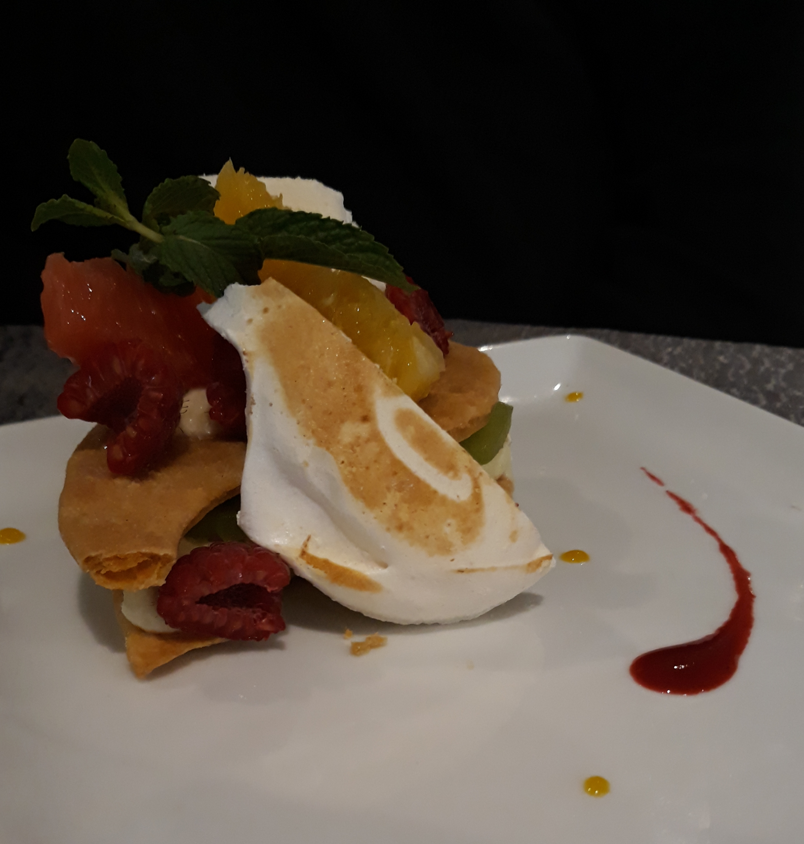 Accueil et service chaleureux et très professionnel. Gâteau d'anniversaire (mille feuilles aux fruits) délicieux. Échange à la fin du repas avec le Chef très apprécié.