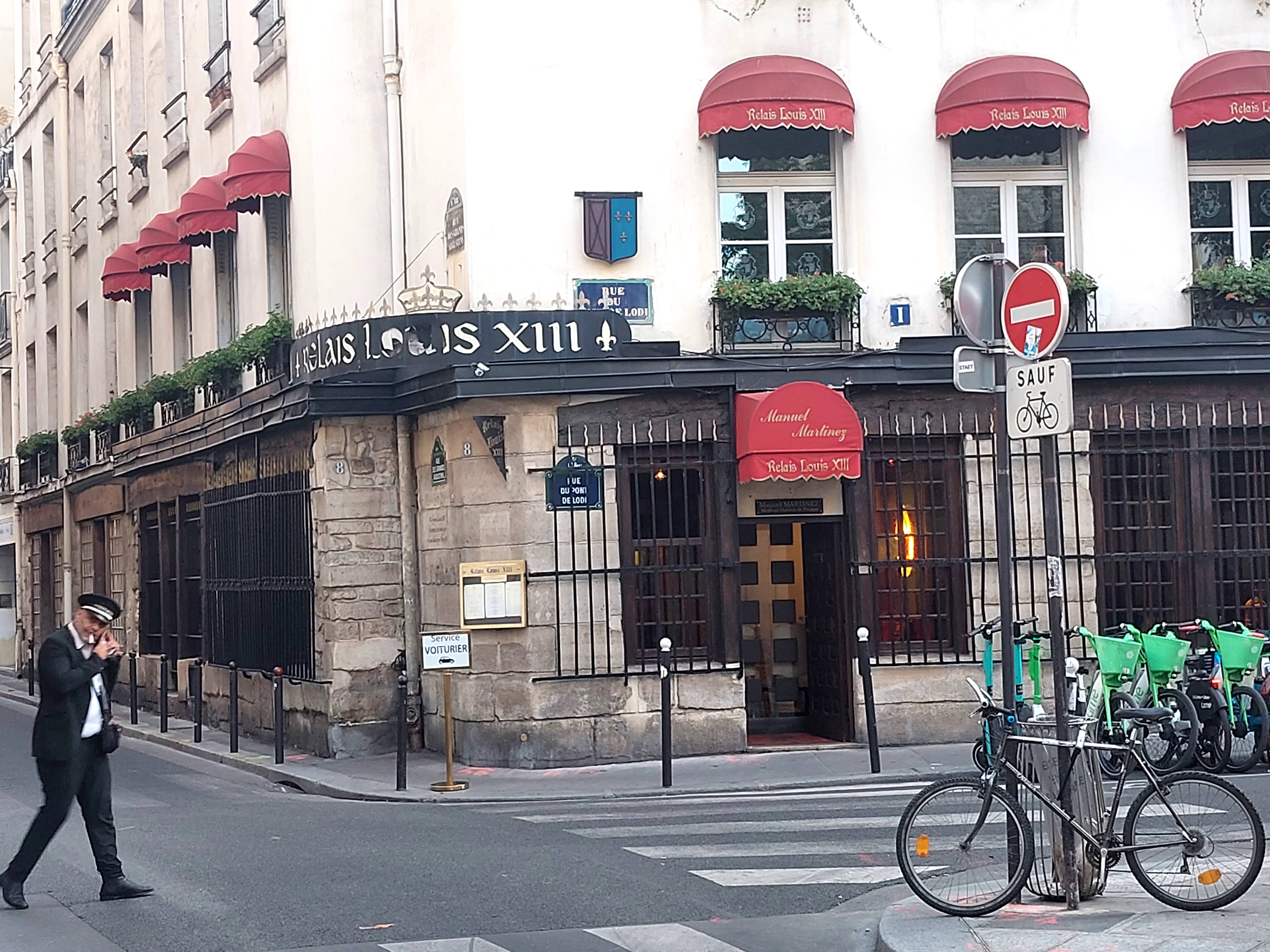 Ancien café-charbon fréquenté par Picasso, il devient le Relais Louis XIII en 1961. Vieilles pierres et nobles poutres, galerie de gravures, portraits de Louis XIII et de Marie de Médicis, fenêtres à carreaux colorés, chaises à hauts dossiers droits recouverts de tissu clouté et les caves du couvent des Grands Augustins, rénovées pour devenir des salons particuliers. Il se trouve en face de l’Hôtel Hercule où Picasso vécût 19 ans. Cet espace était entièrement occupé à l’époque d’Henri IV par le Couvent des Grands Augustins et le futur Louis XIII en était un des élèves parmi toute l’aristocratie de l’époque. Le 10 mai 1610, alors que son père était assassiné rue de la Ferronnerie, il était en classe. On vint le chercher pour le faire proclamer roi par le Parlement. Ce n’est pas sur place, comme l’indique cette plaque apposée sur le mur du restaurant, qu’il fut intronisé.