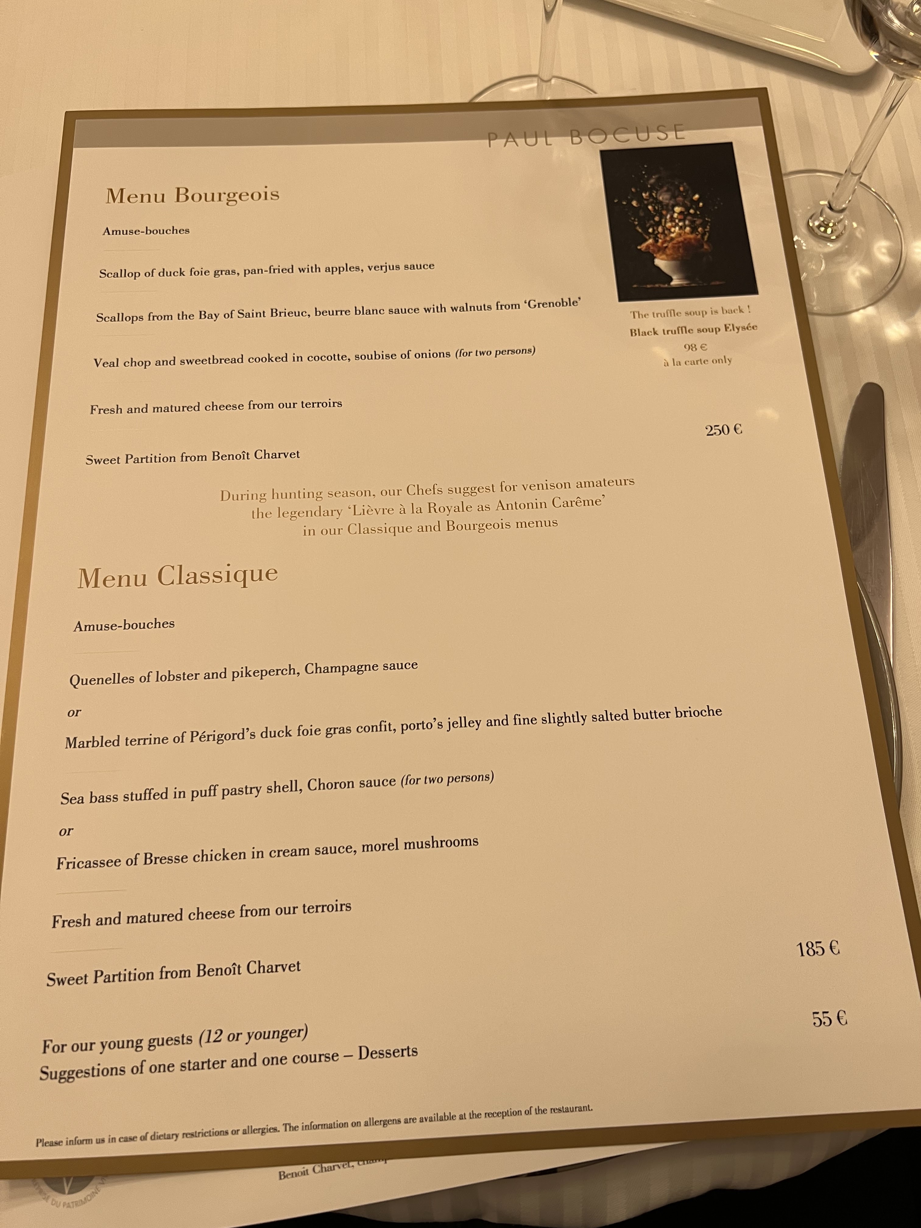 Dîner chez Mr Bocuse une expérience gustative extraordinaire. Nous avions le menu Bourgeois. Ser vice impeccable. Personnel au petits soins. Et comme c'était pour notre anniversaire de mariage, nous avons eu petit tableau en chocolat avec bougie et la musique de l'orgue de barbarie. Nous avons passé une excellente soirée.